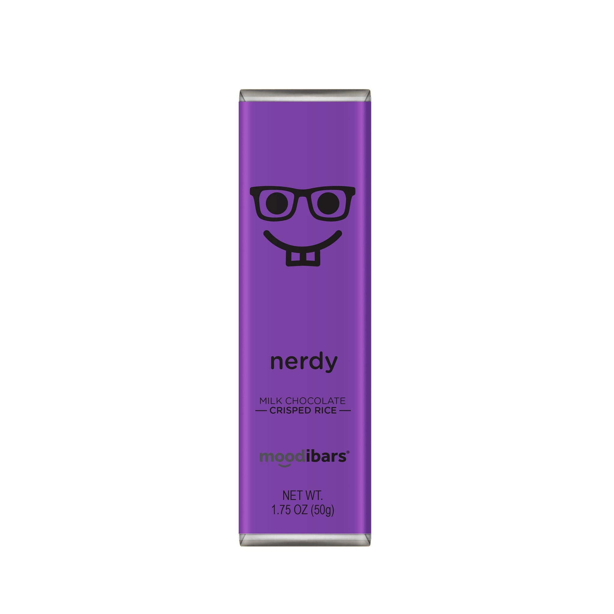 Moodibars® NERDY fine Milk Chocolate with Crisped Rice 1.75oz bar Get super NERDY and take yourself on a delicious trip of puffy crisped rice enrobed in fine milk chocolate! It's delicious! Heat Sensitive! Please store in a cool dry room and keep from direct sunlight.