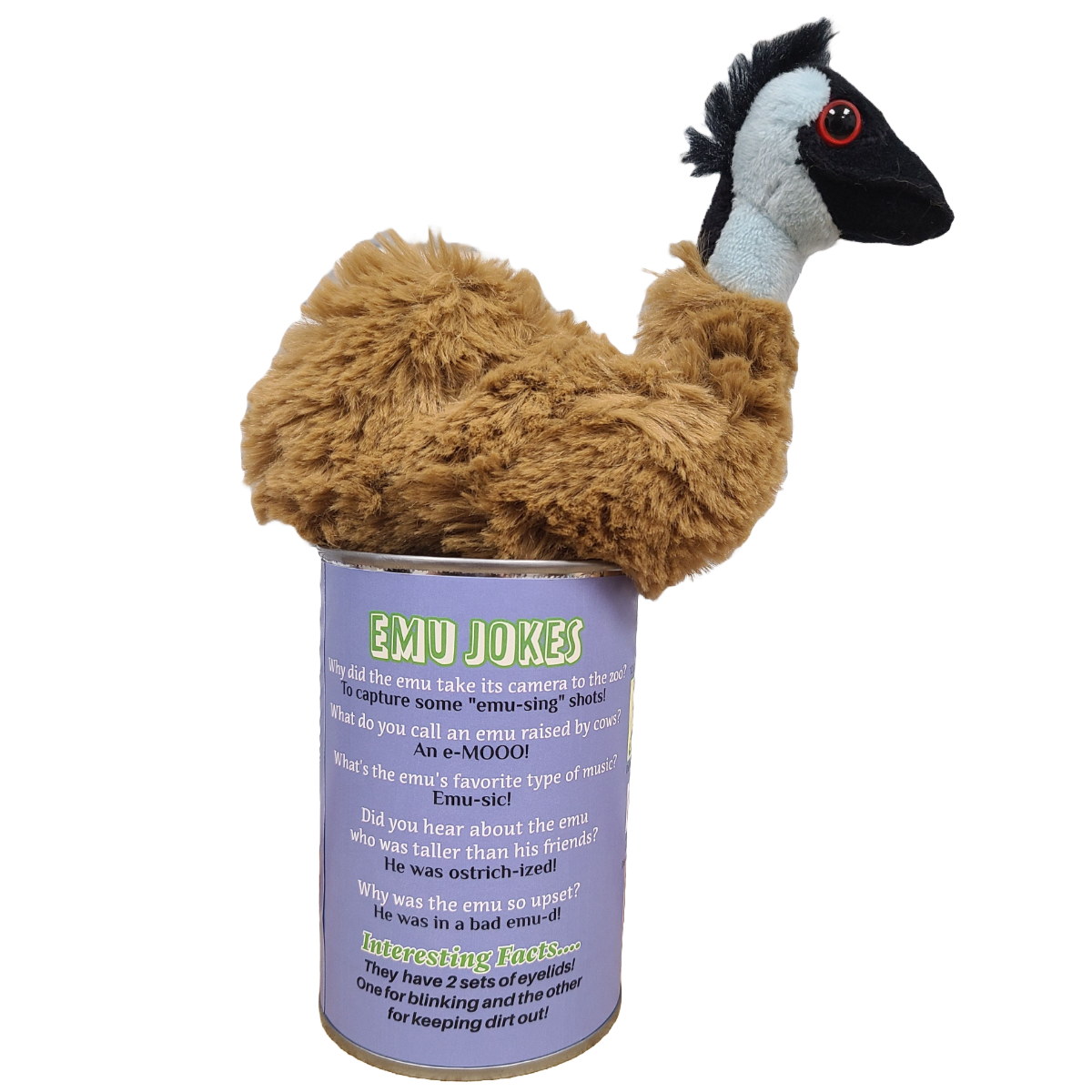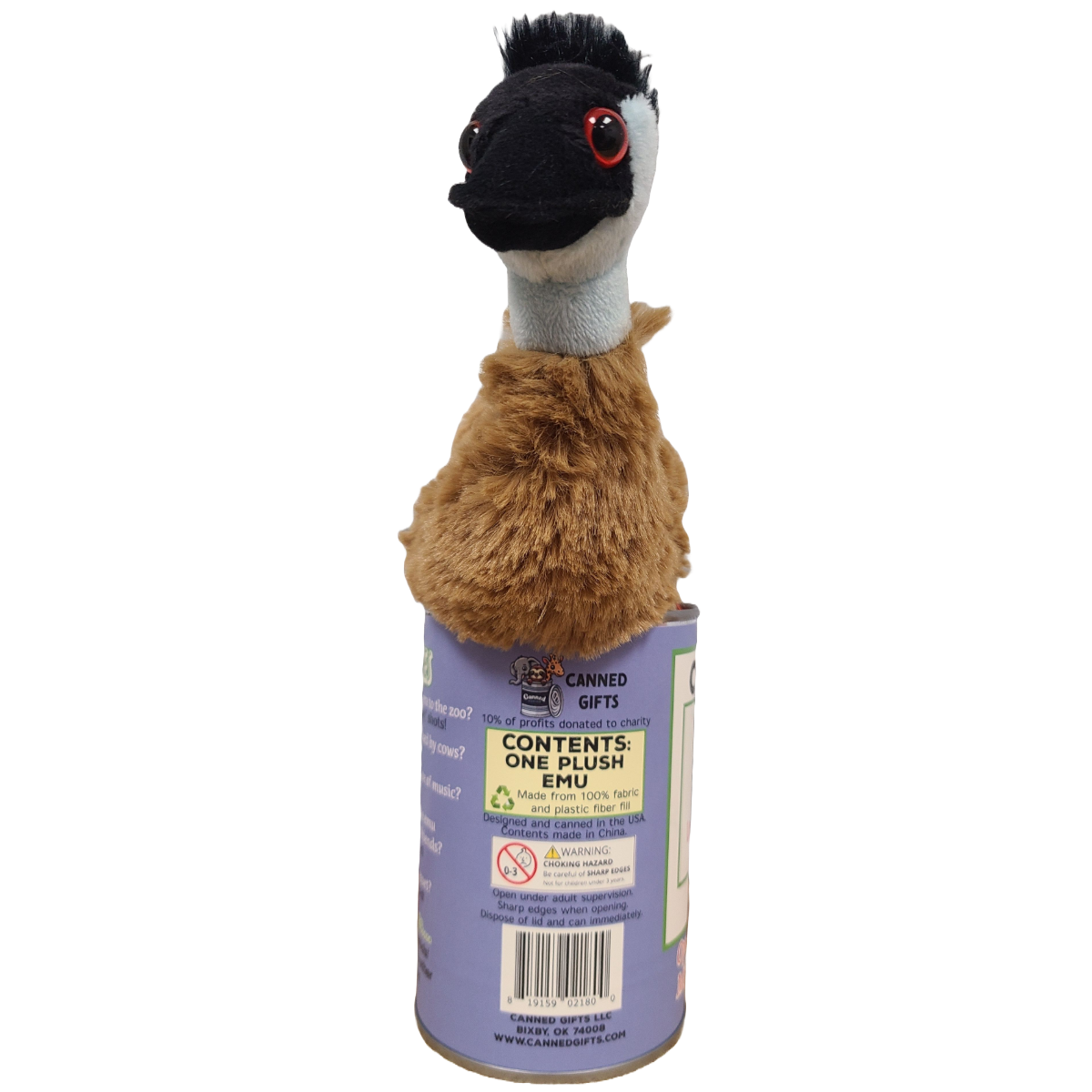 Included is 1 plush emu sealed in a soup can. Use a can opener to open the fun gift or choose a pop top lid